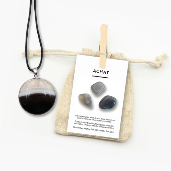 Zur optimalen Aufbewahrung wird der wunderschöne Achat Anhänger in einem Natur-Jutebeutel geschützt.