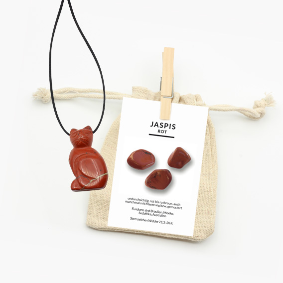 Zur optimalen Aufbewahrung wird der wunderschöne Katzen Anhänger in einem Natur-Jutebeutel geschützt. Eine ausführliche Beschreibungskarte wird mitgeliefert. Auf dieser sind allgemeine Informationen sowie die Heilwirkungen auf Körper, Geist und Seele gut zum Immer-wieder-Nachlesen zusammengefasst.