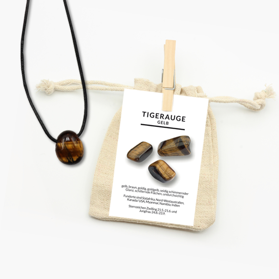 Zur optimalen Aufbewahrung wird der wunderschöne kleine Tigerauge Trommelstein Anhänger in einem Natur-Jutebeutel geschützt. Eine ausführliche Beschreibungskarte wird mitgeliefert. Auf dieser sind allgemeine Informationen sowie die Heilwirkungen auf Körper, Geist und Seele gut zum Immer-wieder-Nachlesen zusammengefasst.