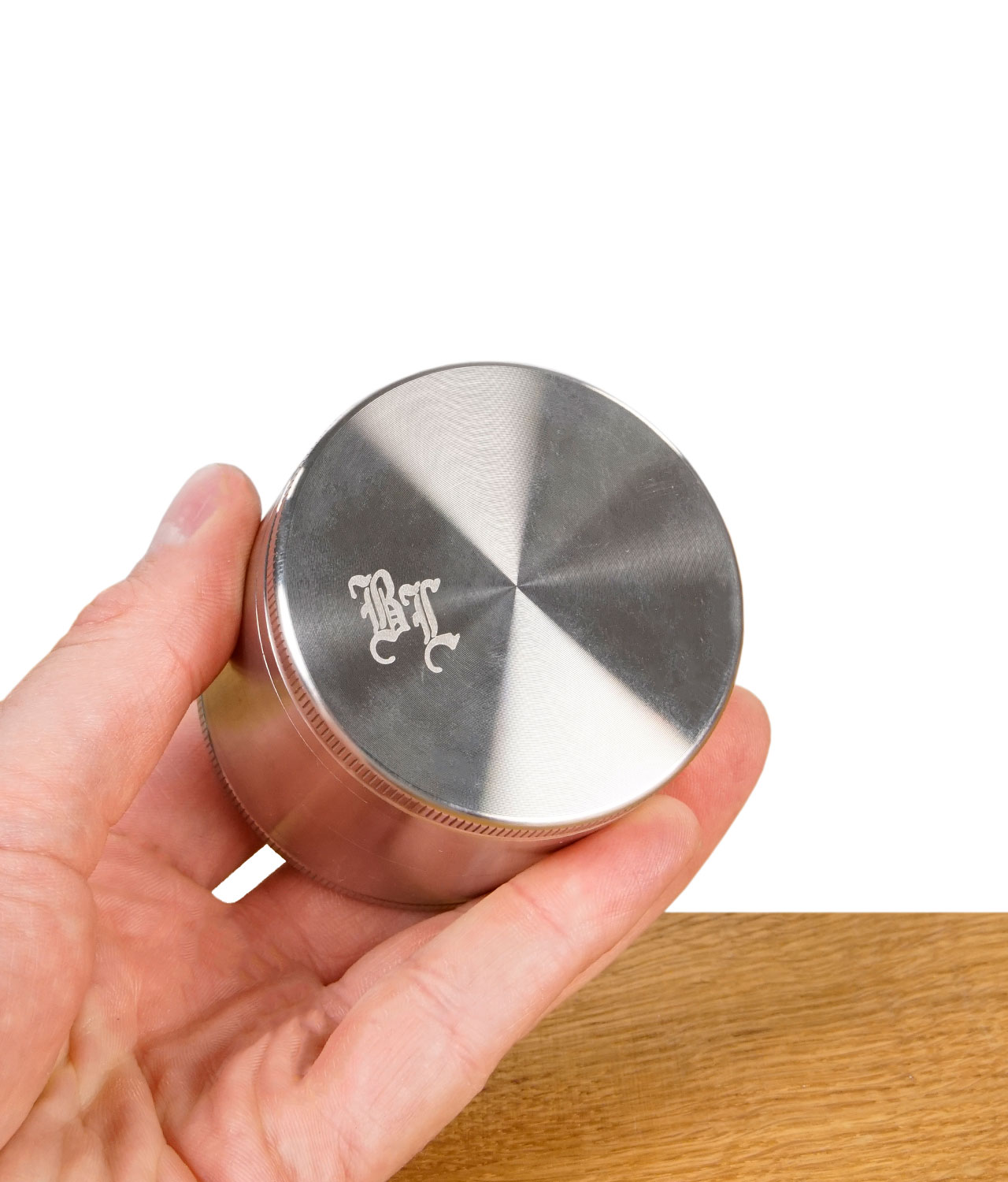 Die silberne Farbe resultiert aus dem unlackierten, reinen Edelstahl, was ihm eine zeitlose und edle Optik verleiht. Mit einem Außendurchmesser von 63mm, einem Innendurchmesser des Mahlwerks von 58,5mm und einer Höhe von 52mm bietet er eine großzügige Mahlkapazität von etwa 1,7 bis 2,0 Gramm Kräutern auf einmal.