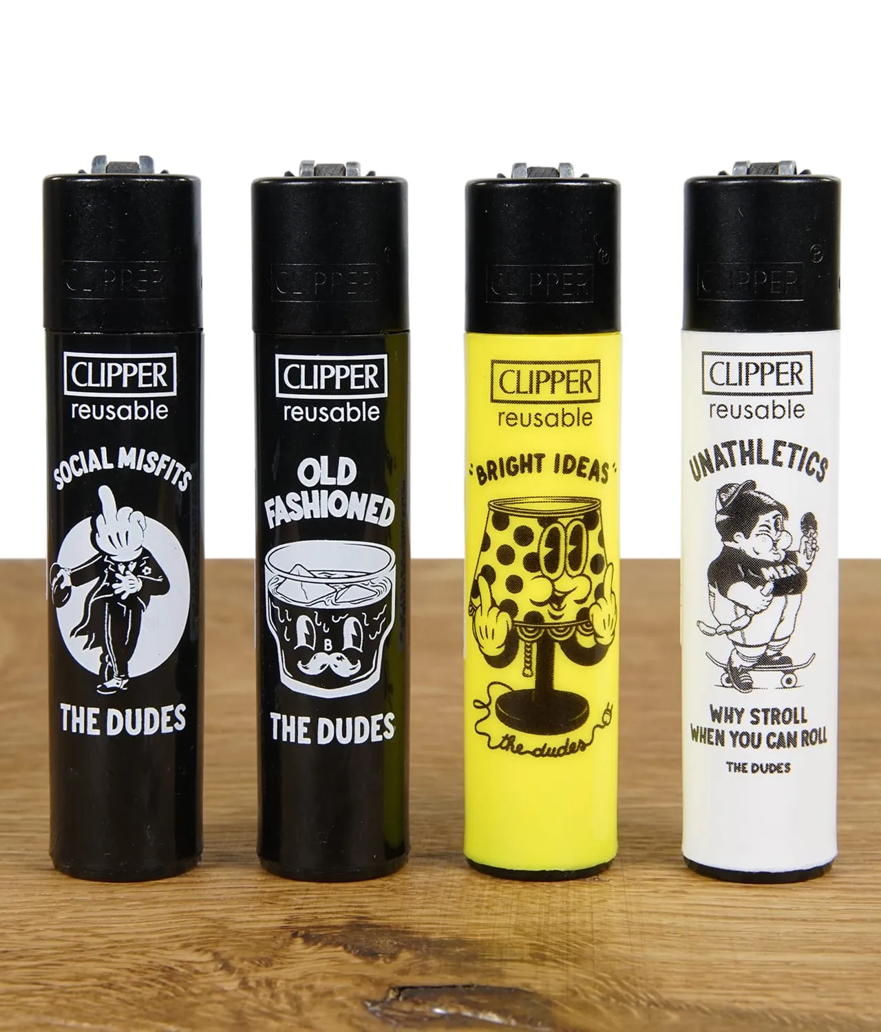 Erlebe den Zauber der goldenen Ära der Animation, mit dem Clipper Feuerzeug The Dudes! Inspiriert von den klassischen schwarz-weißen Zeichentrickfilmen der sechziger Jahre, verzaubert diese Clipper Reihe jeden Sammler mit seinen Cartoon-Figuren.