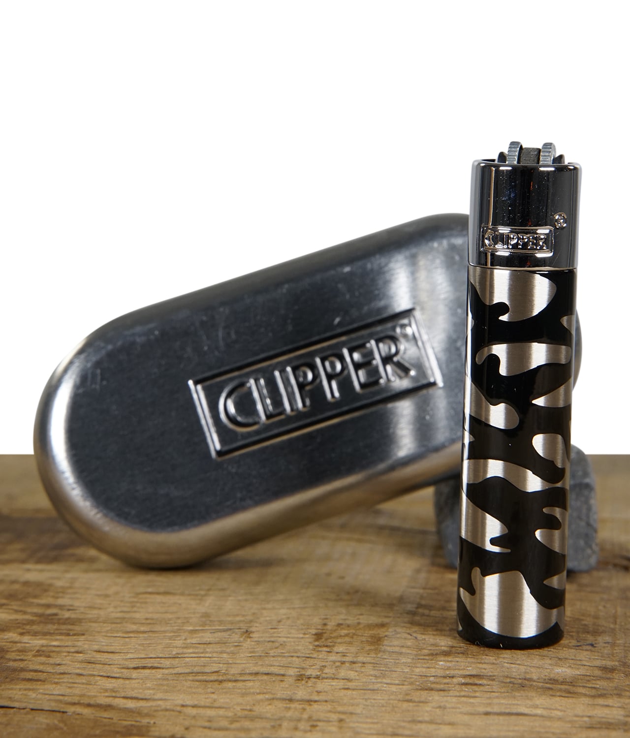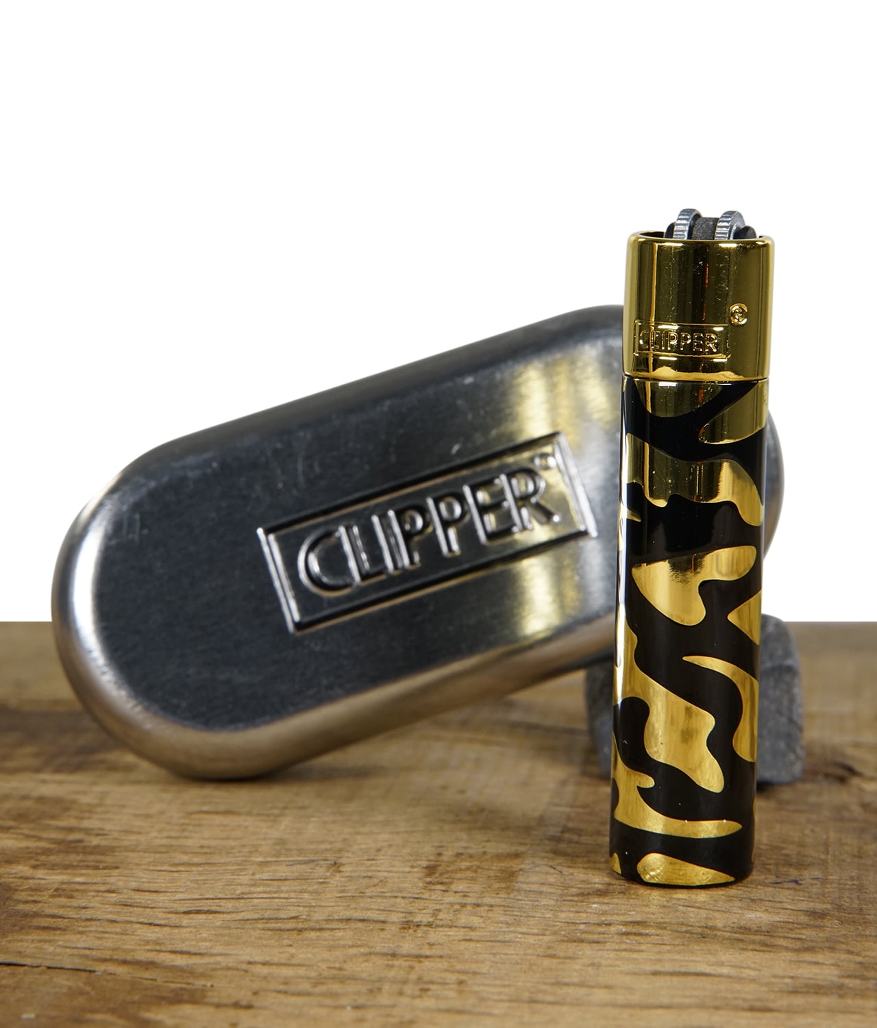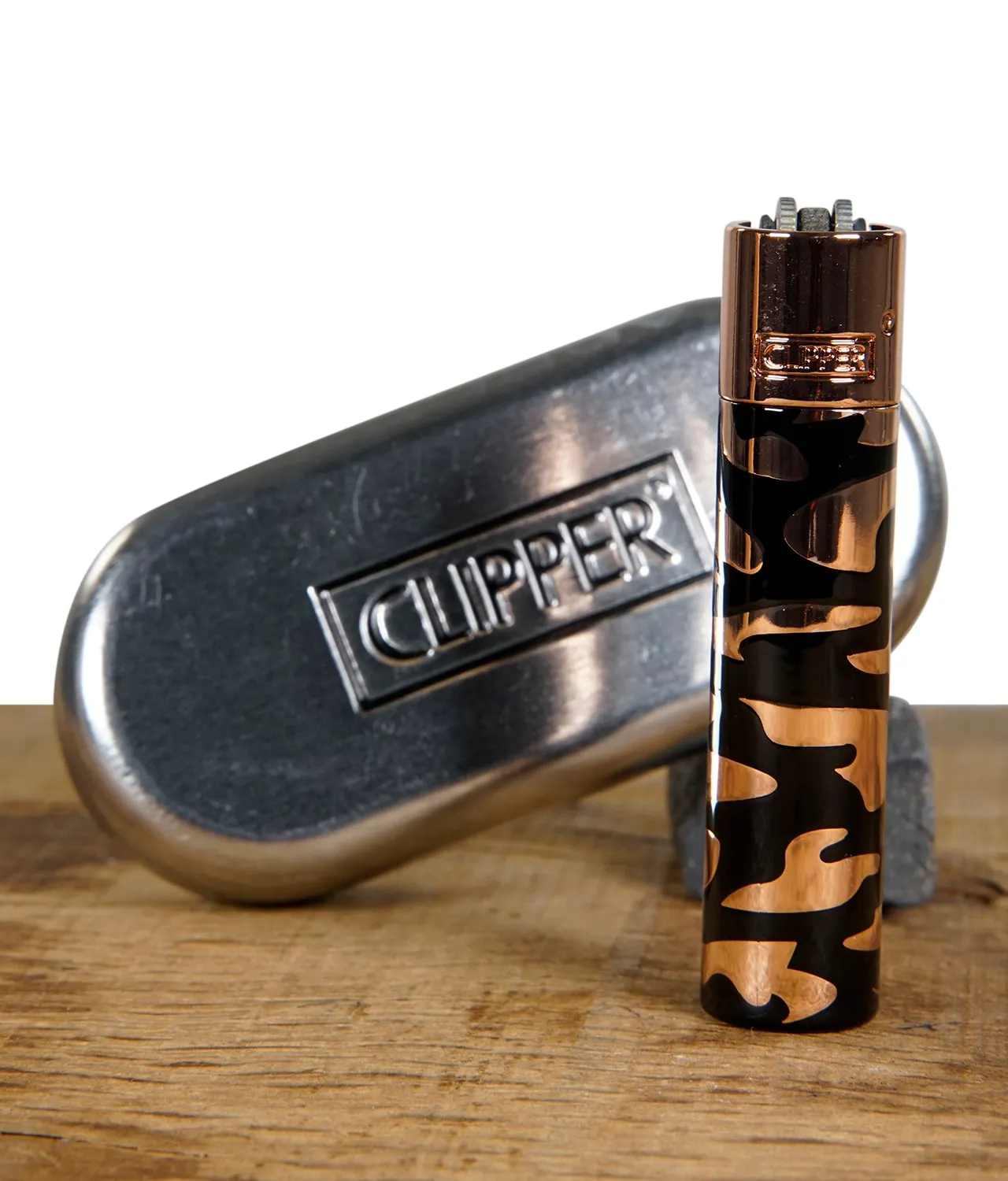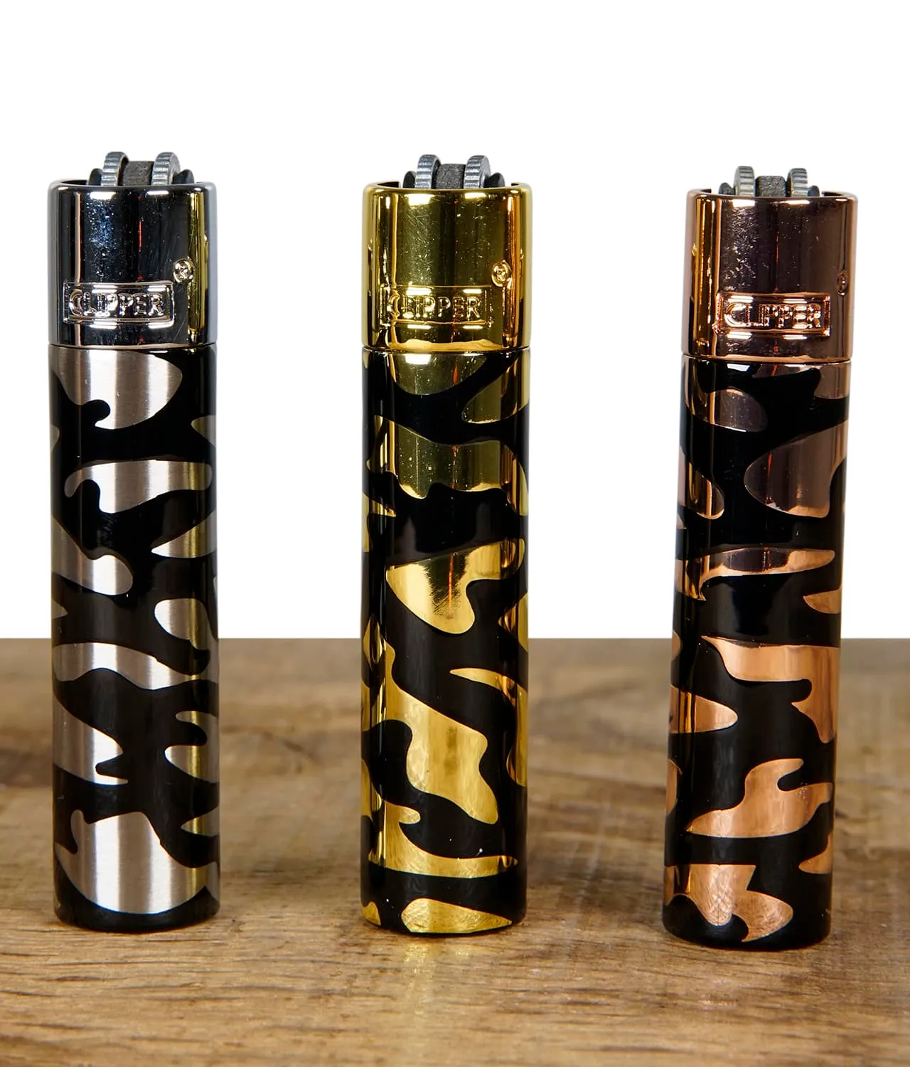Das Clipper Metall Feuerzeug Camouflage gibt es in den drei stilvollen Farben Gold, Kupfer und Silber. Alle Varianten bestechen durch ihr robustes Metallgehäuse und das auffällige Camouflage-Muster, das jedem Feuerzeug einen einzigartigen Look verleiht. Die Feuerzeuge sind nachfüllbar und mit einem austauschbaren Feuerstein ausgestattet, was sie besonders nachhaltig und langlebig macht – perfekt für den Alltag oder als Sammlerstück.