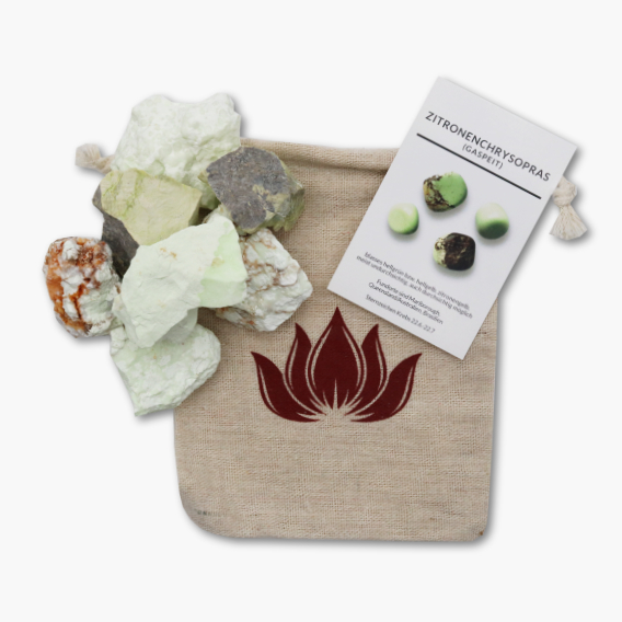 Die Zitronenchrysopras (Gaspeit) Rohsteine im Leinenbeutel können für vielfältigste Dekorationen oder Heil-Anwendungen verwendet werden.