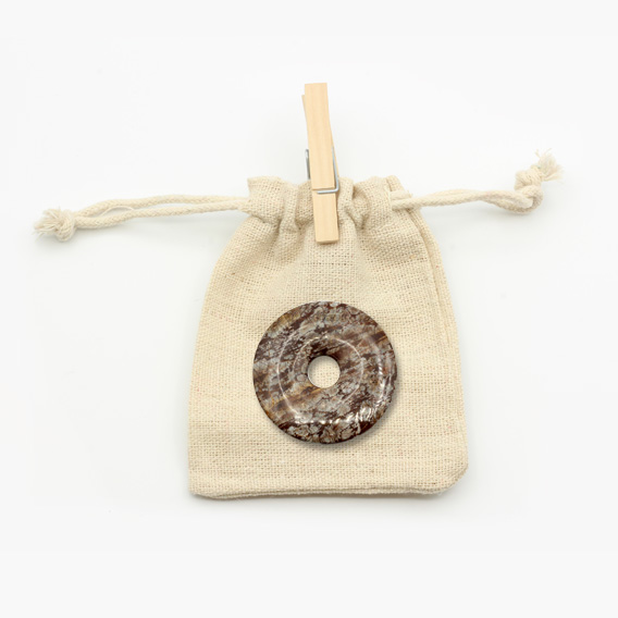 Zur optimalen Aufbewahrung wird der Donut in einem Natur-Jutebeutel geschützt. Eine ausführliche Beschreibungskarte wird mitgeliefert. Auf dieser sind allgemeine Informationen sowie die Heilwirkungen auf Körper, Geist und Seele gut zum Immer-wieder-Nachlesen zusammengefasst.