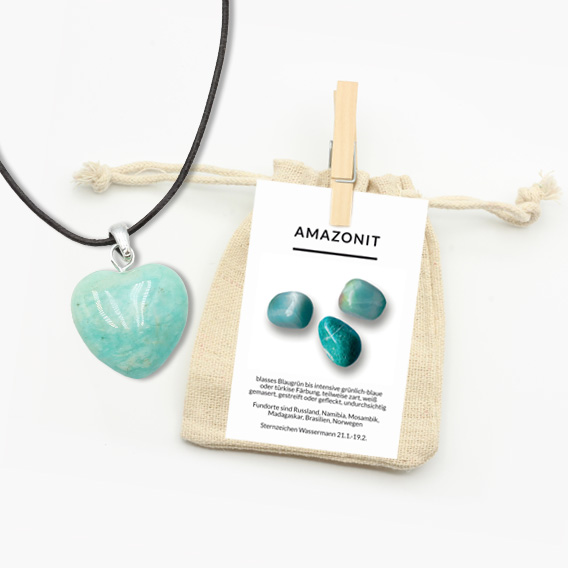 Unser Edelstein Herz Anhänger wird in einem charmanten Jutebeutel geliefert, der nicht nur eine umweltfreundliche Verpackungsoption darstellt, sondern auch eine rustikale Ästhetik vermittelt. Eine Beschreibungskarte mit allgemeinen Informationen sowie Heilwirkungen auf Körper, Geist und Seele des Amazonit wird mitgeliefert.