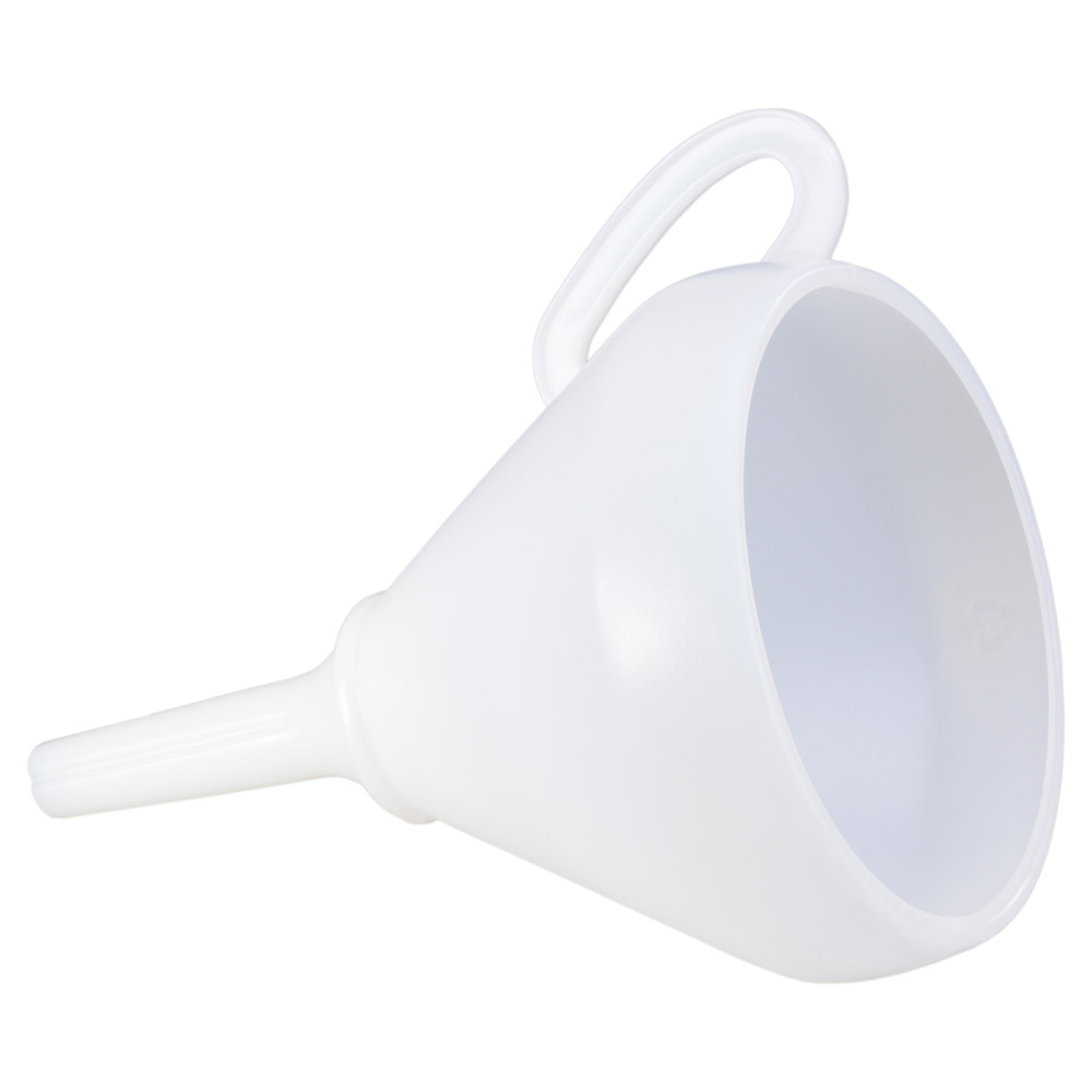 Universaltrichter mit Griff und Sieb aus bruchsicherem Polyethylen (HD-PE), naturfarben.