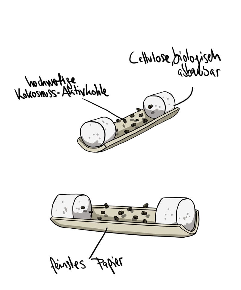 Sie erspart es euch nicht nur lästige Teilchen oder flüssig gewordene Aktivkohle in den Mund zu bekommen, sondern vermindert dank ihrer hohen Saugfähigkeit auch noch die Wahrscheinlichkeit des Verstopfens. Ein weiterer Vorteil gilt der Natur, denn diese lässt sich wesentlich schneller abbauen als beispielsweise Keramik oder ähnliche Materialien.