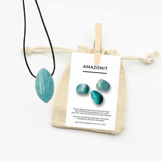 Zur optimalen Aufbewahrung wird der wunderschöne Navette Anhänger aus Amazonit in einem Natur-Jutebeutel geschützt. Eine ausführliche Beschreibungskarte wird mitgeliefert. Auf dieser sind allgemeine Informationen sowie die Heilwirkungen auf Körper, Geist und Seele gut zum Immer-wieder-Nachlesen zusammengefasst.