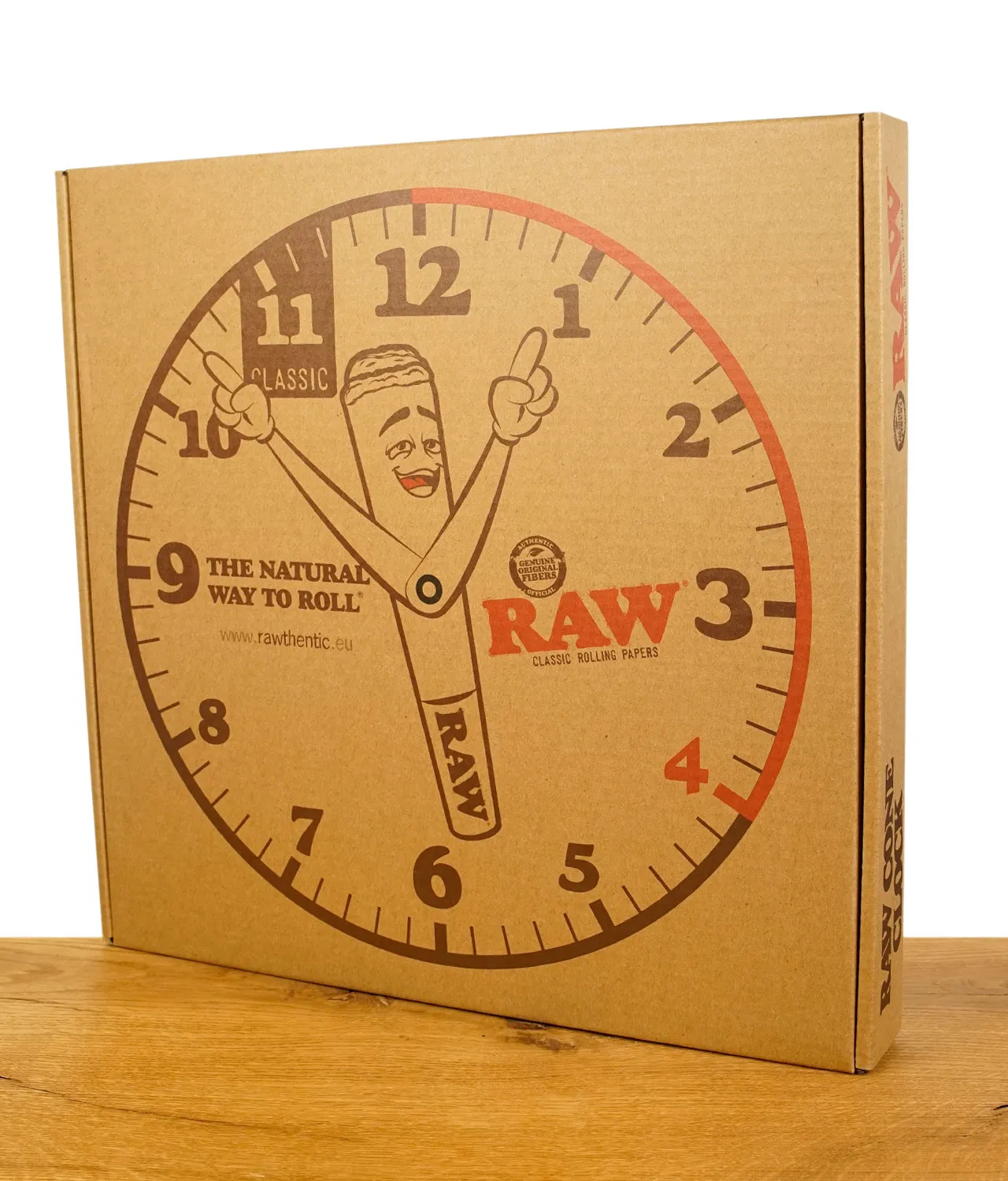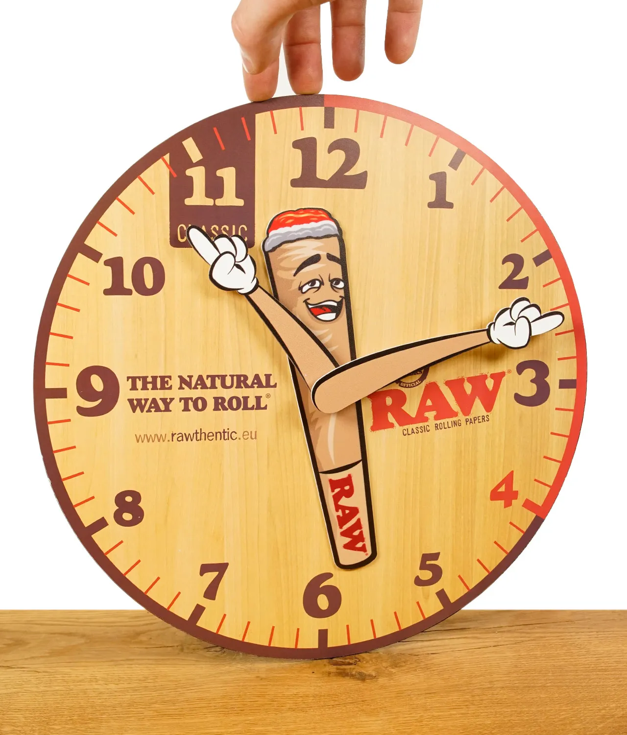 Die RAW Cone Wanduhr ist eine klassische Wanduhr mit 30cm Durchmesser und gutem Design. In der Mitte der Uhr ist ein Joint wessen Arme als Zeiger für Stunden und Minuten dienen. Gefertigt aus Holz ist diese Uhr mit ihrem Farbton passend für alle Wohnzimmer, Headshops oder sogar die bald folgenden Social Clubs. Umgeben ist die Uhr von einem roten Rahmen, der dem Design einen poppigen Akzent verleiht. Das RAW-Logo ist prominent auf der rechten Seite der Uhr platziert, zusammen mit dem Slogan "The Natural Way to Roll". Diese Uhr ist nicht nur funktional, sondern bringt auch eine humorvolle Note in jeden Raum.