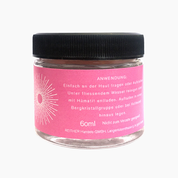 Rosenquarz unter fließendem Wasser reinigen oder mit Hämatit entladen. Aufladen in einer Bergkristallgruppe oder bei Vollmond hinauslegen.