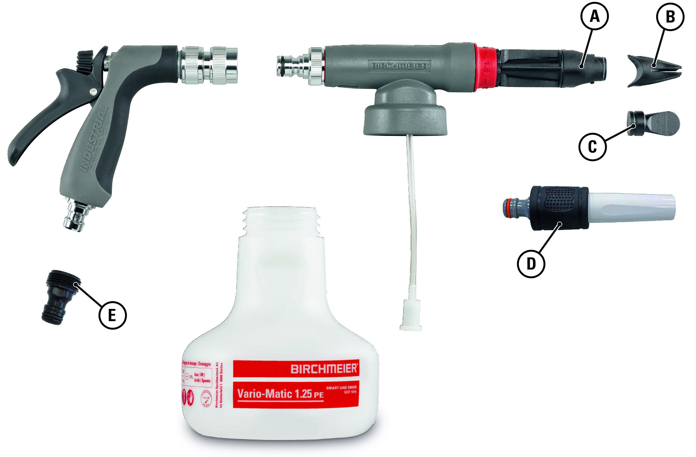 Bei der Entwicklung der neuen Schaumkanone Vario-Matic 1.25 PE standen die verbesserte Bedienerfreundlichkeit und erweiterte Anwendungsmöglichkeiten im Vordergrund. Das Herzstück des Gerätes ist der neu konzipierte Mischkopf mit vier Dosierstufen. Damit lassen sich Mischverhältnisse von 1.5% / 2.5 %/ 5.0% und 10% oder nur Wasser einstellen.