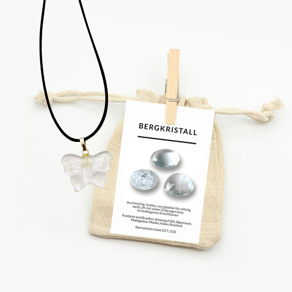 Zur optimalen Aufbewahrung wird der wunderschöne Schmetterling Anhänger aus Bergkristall in einem Natur-Jutebeutel geschützt. Eine ausführliche Beschreibungskarte wird mitgeliefert. Auf dieser sind allgemeine Informationen sowie die Heilwirkungen auf Körper, Geist und Seele gut zum Immer-wieder-Nachlesen zusammengefasst.