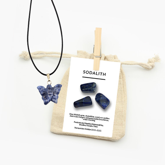 Zur optimalen Aufbewahrung wird der wunderschöne Schmetterling Anhänger aus Sodalith in einem Natur-Jutebeutel geschützt. Eine ausführliche Beschreibungskarte wird mitgeliefert. Auf dieser sind allgemeine Informationen sowie die Heilwirkungen auf Körper, Geist und Seele gut zum Immer-wieder-Nachlesen zusammengefasst.