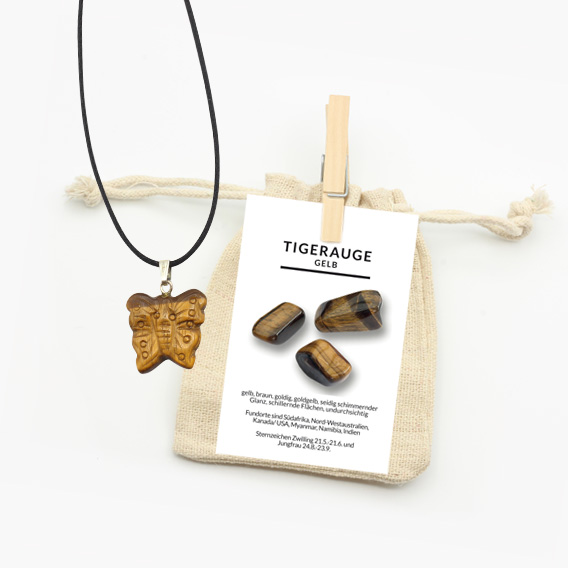 Zur optimalen Aufbewahrung wird der wunderschöne Schmetterling Anhänger aus Tigerauge gelb in einem Natur-Jutebeutel geschützt. Eine ausführliche Beschreibungskarte wird mitgeliefert. Auf dieser sind allgemeine Informationen sowie die Heilwirkungen auf Körper, Geist und Seele gut zum Immer-wieder-Nachlesen zusammengefasst.