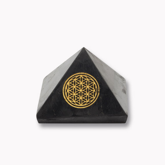 Die wunderschöne Pyramide aus dem Edelstein Shungit hat eine hochwertige vergoldete Gravur.