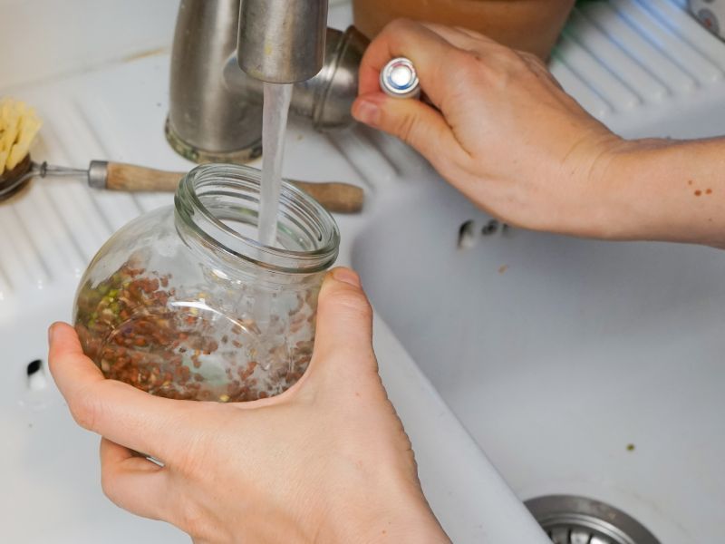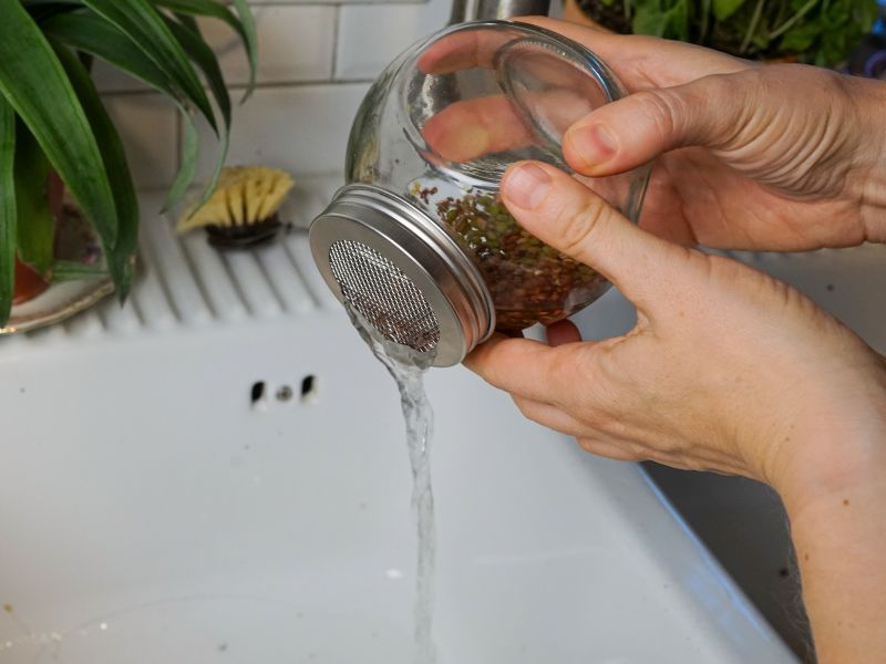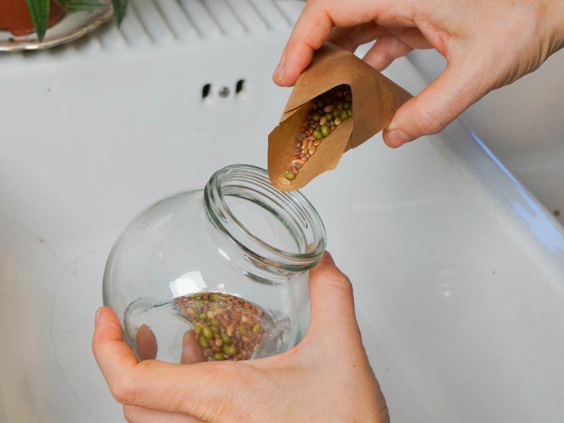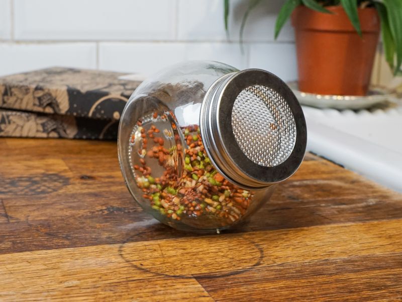 - Gib ca. einen Esslöffel Sprossensamen in das Sprossenglas.