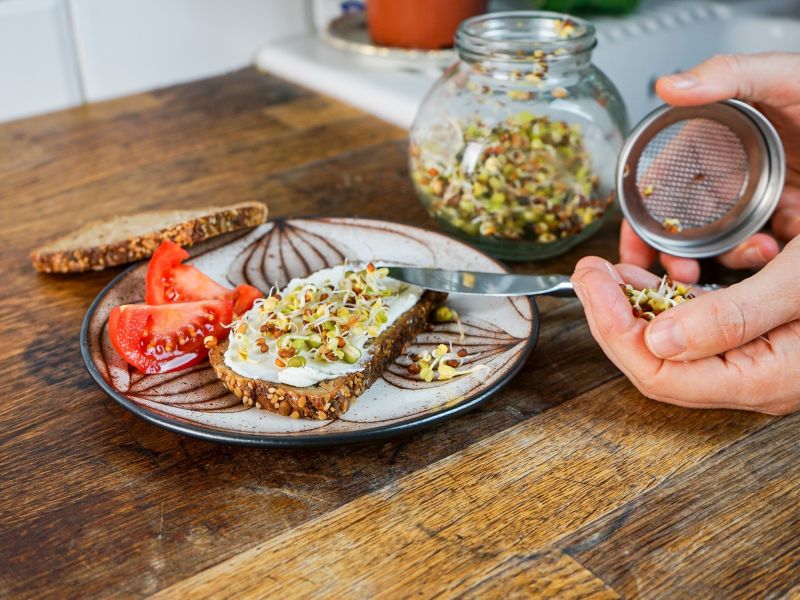 - Nach 4-7 Tagen sind deine Sprossen genussreif und bereichern deine belegten Brote, Suppen, Salate, Bowls und weitere Mahlzeiten als vitamin- und eiweißreiches Topping.