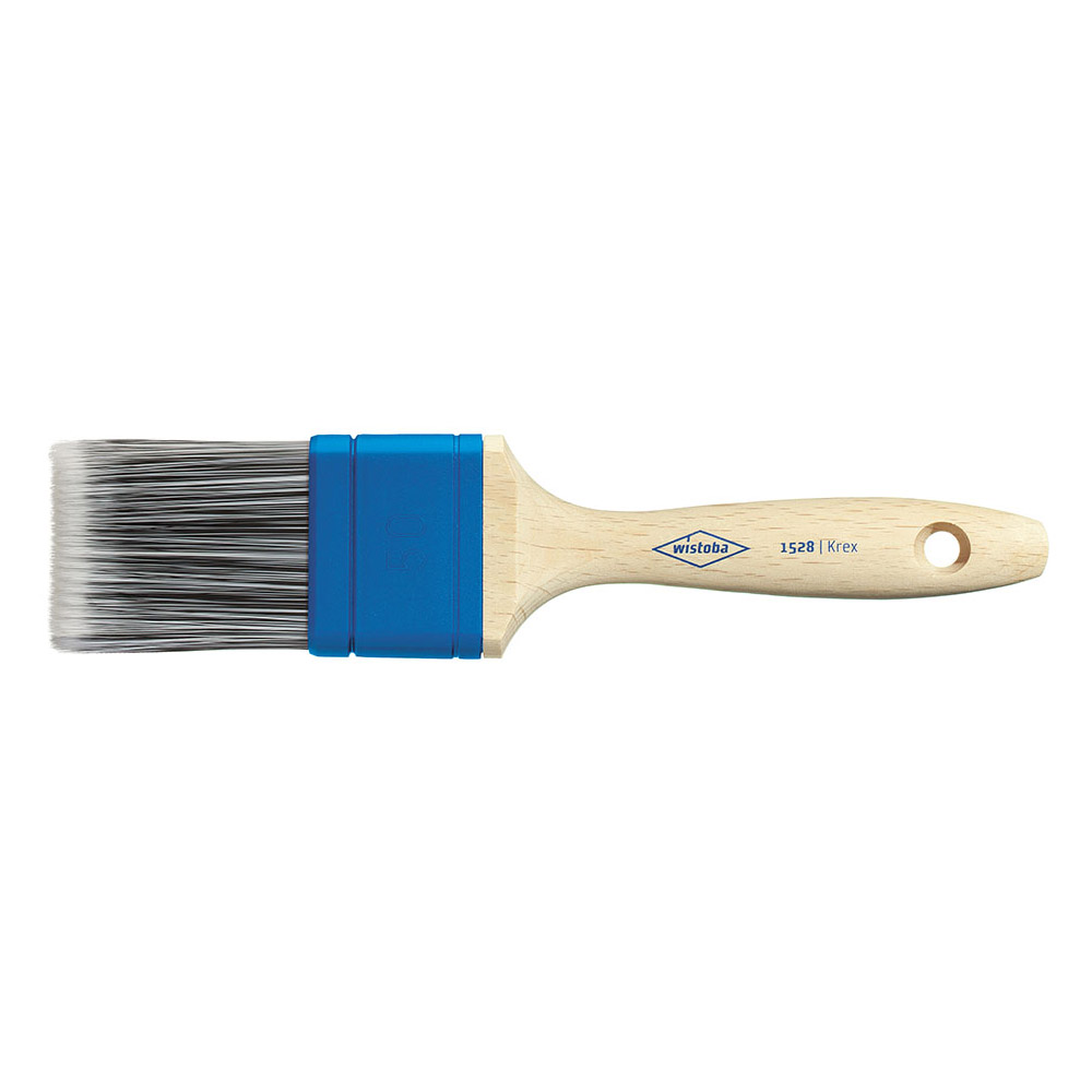 Flachpinsel, Krex Kunstfasern, XII. Stärke, vollverklebt in blauen Kunststoff-Fassungen, rohe Holzstiele.