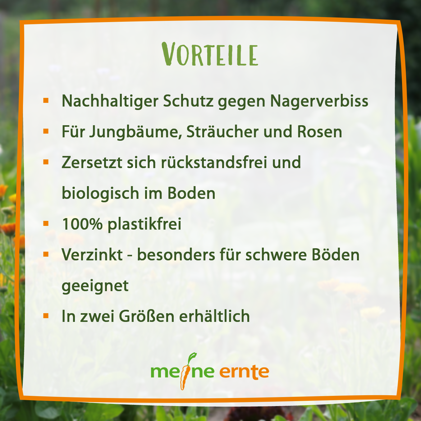 Wurzelverbiss durch Nager, besonders durch Wühlmäuse, kann deine jungen Bäume schädigen. Der Wühlmauskorb aus Drahtgeflecht bietet eine nachhaltige, einfache und umweltbewusste Lösung gegen Nagerfraß. Den Tieren und anderen Bodenlebewesen wird dabei kein Schaden zugefügt.