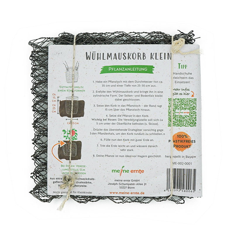 Der Wühlmauskorb besteht aus Sechseckdrahtgeflecht mit 16 mm Maschenweite und 0,6 mm Drahtstärke. Dadurch ist der Korb stabil, bleibt aber flexibel genug, um das Wurzelwerk ungehindert wachsen zu lassen. Die engen Maschen weiten sich während des Wachstums, aber lassen auch junge Wühlmäuse nicht durch.