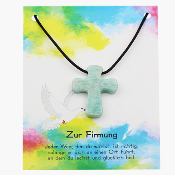 „Zur Firmung“ Pilgerkreuz Anhänger aus Amazonit auf großer Karte